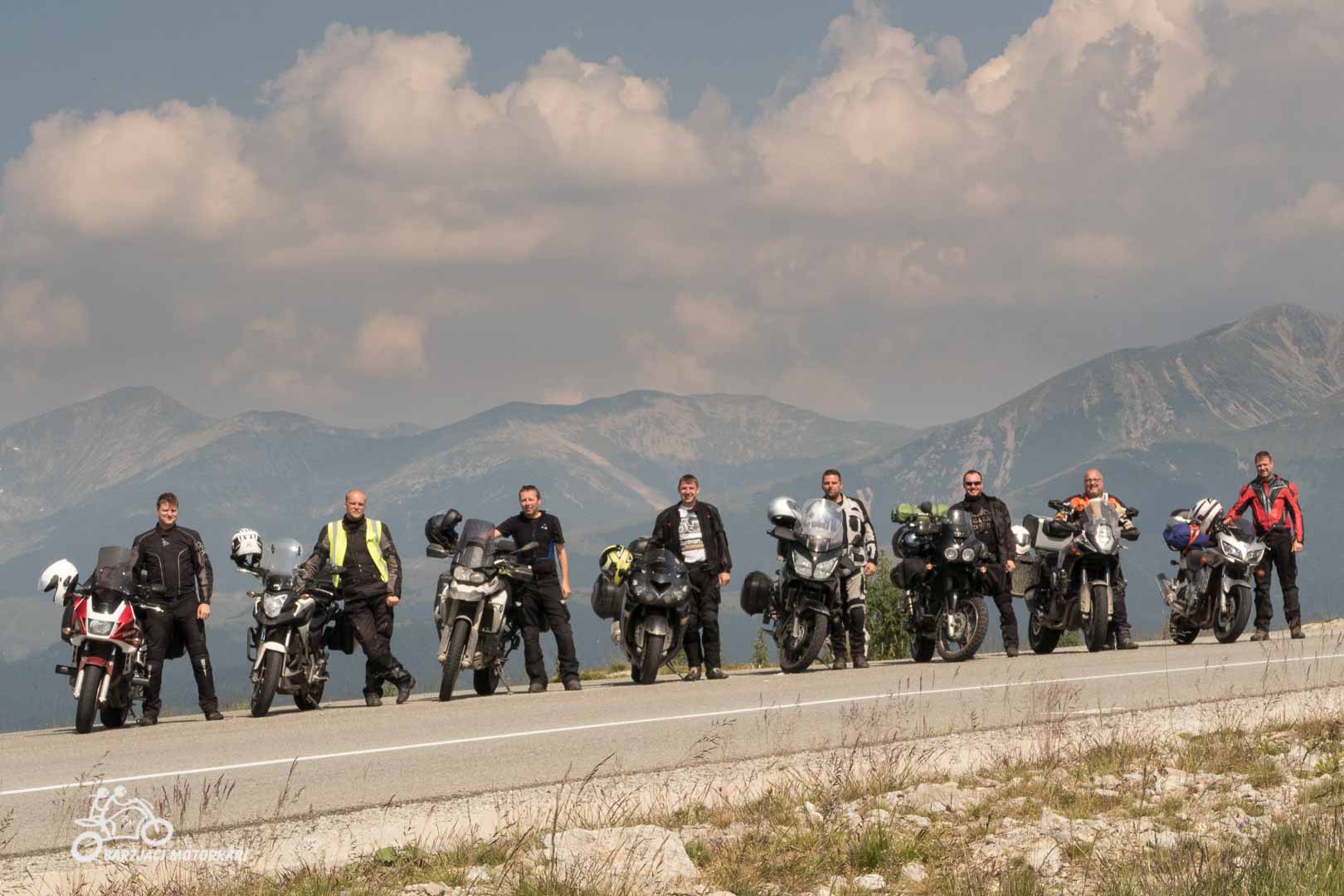 Suprovka. Nový asfalt, jen v každé zatáčce je na asfaltu vylitý betonový škraloup, takže tady si prostě člověk v zatáčkách v klidu nezajezdi. Vyjíždíme až na sedlo 2200 mnm, kde blikáme hromadnou skupinovou fotku, tentokrát i s Jardou.